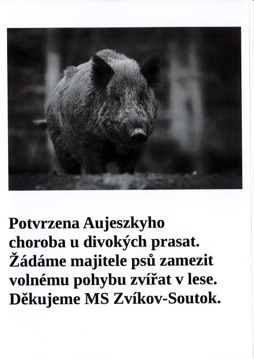Potvrzena Aujeszkyho choroba u divokých prasat. Žádáme majitelé psů zamezit volnému pohybu zvířat v lese. Děkujeme MS Zvíkov - Soutok